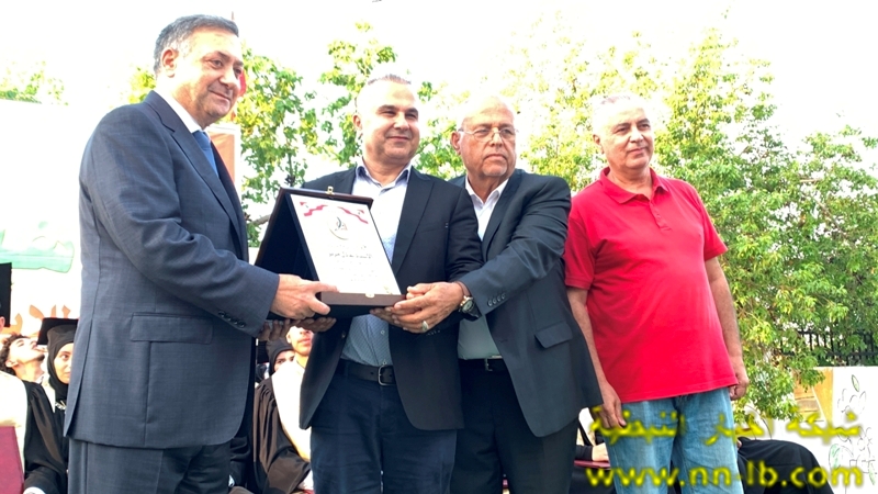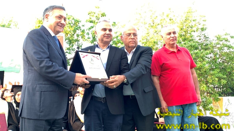 بعدها قدم النائب جابر ، ورئيس هيئة انماء انصار معين عاصي درعا تقديريا لمدير ثانوية انصار الرسمية عادل مزنر ، ثم جرى توزيع شهادات تقديرية على الطلاب المكرمين .